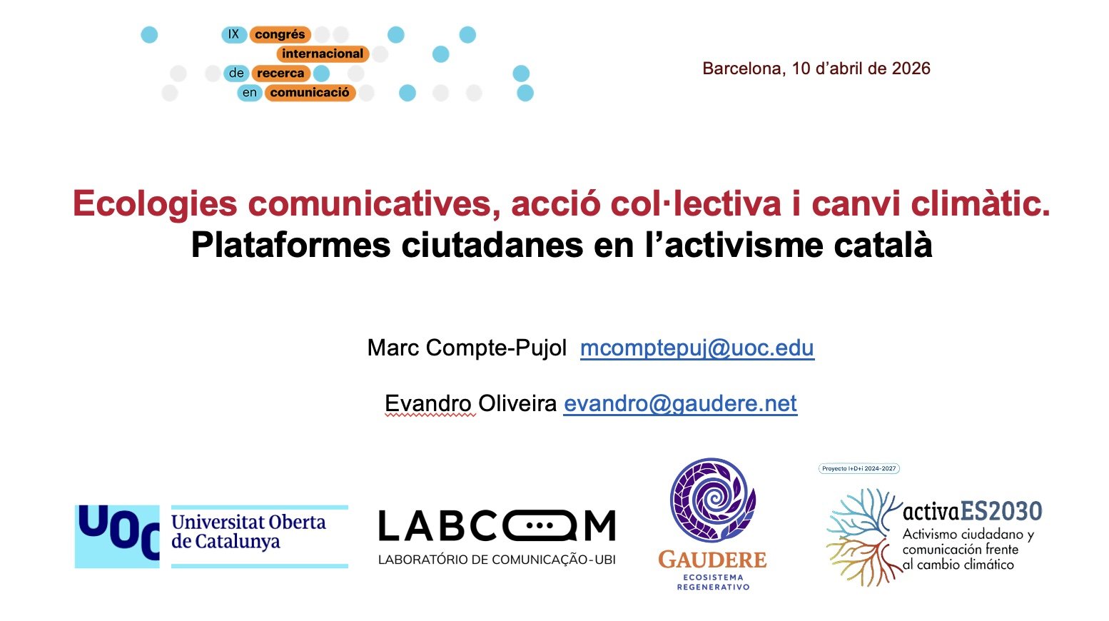 Evandro Oliveira, fundador de Gaudere y investigador vinculado a LabCom — Universidade da Beira Interior, ha desarrollado una línea de investigación sólida sobre comunicación estratégica, activismo y organizaciones civiles. Esta investigación, coautorada con Marc Compte-Pujol, prolonga esa mirada hacia un objeto de estudio especialmente relevante en el contexto catalán: las plataformas y colectivos que articulan el activismo climático desde abajo.
